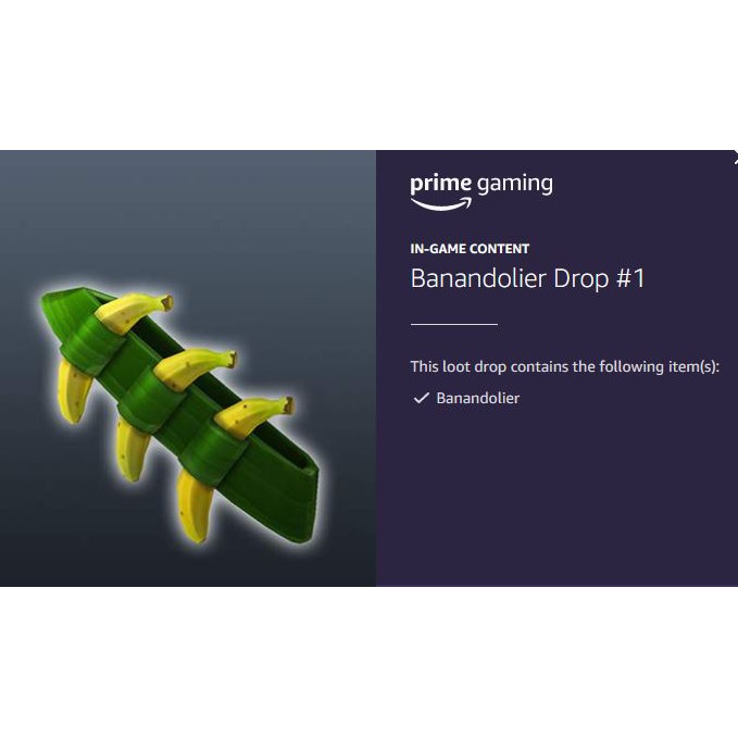 The first item is the banandolier, and subscribers can snag a code for the item prime gaming. We're the official amazon prime home for gamers!